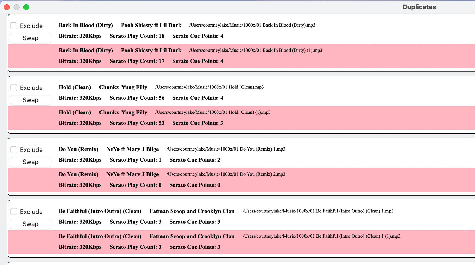 Each duplicate track includes 'Exclude' and 'Swap' options, giving you control over which file to keep or discard.